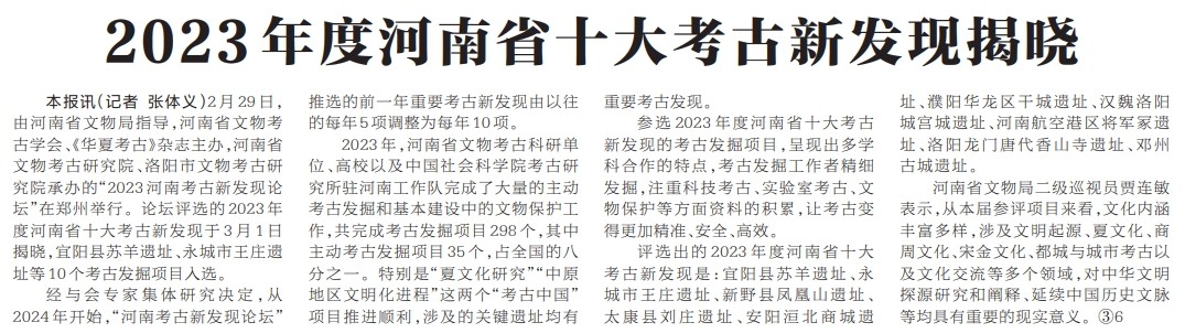 2月29日,由河南省文物局指导,河南省文物考古学会、《华夏考古》杂志主办,河南省文物考古研究院、洛阳市文物考古研究院承办的“2023河南考古新发现论坛”在郑州举行。论坛评选的2023年度河南省十大考古新发现于3月1日揭晓,宜阳县苏羊遗址、永城市王庄遗址等10个考古发掘项目入选。(今日《河南日报》3版)