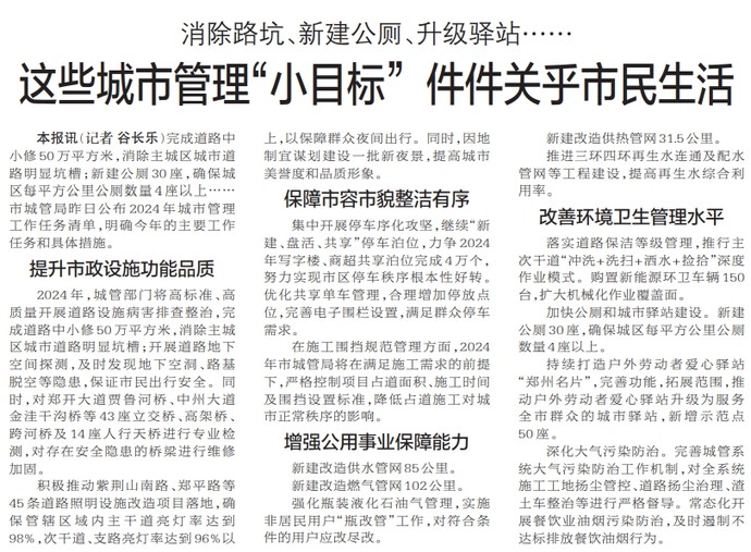 完成道路中小修50万平方米,消除主城区城市道路明显坑槽;新建公厕30座,确保城区每平方公里公厕数量4座以上……市城管局昨日公布2024年城市管理工作任务清单,明确今年的主要工作任务和具体措施。(今日《郑州日报》2版)