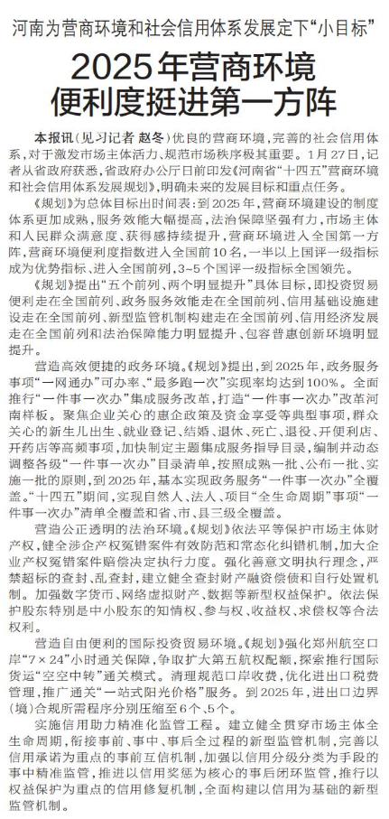 优良的营商环境,完善的社会信用体系,对于激发市场主体活力、规范市场秩序极其重要。1月27日,记者从省政府获悉,省政府办公厅日前印发《河南省“十四五”营商环境和社会信用体系发展规划》,明确未来的发展目标和重点任务。(今日《郑州日报》2版)