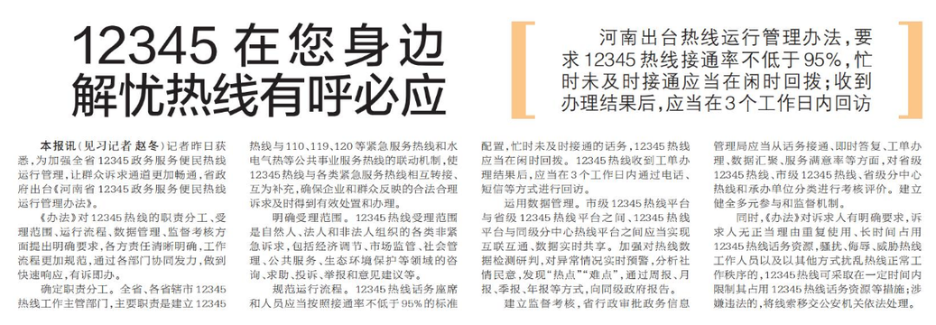 河南出台热线运行管理办法,要求12345热线接通率不低于95%,忙时未及时接通应当在闲时回拨;收到办理结果后,应当在3个工作日内回访