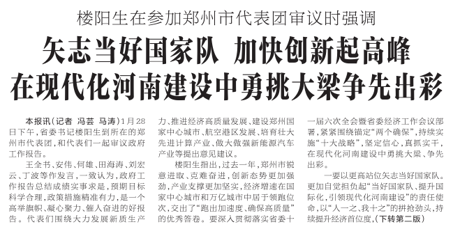 楼阳生指出,过去一年,郑州市锐意进取、克难奋进,创新态势更加强劲,产业支撑更加坚实,经济增速在国家中心城市和万亿城市中居于领跑位次,交出了“跑出加速度、确保高质量”的优秀答卷。要深入贯彻落实省委十一届六次全会暨省委经济工作会议部署,紧紧围绕锚定“两个确保”,持续实施“十大战略”,坚定信心,真抓实干,在现代化河南建设中勇挑大梁、争先出彩。(今日《河南日报》1版、2版)