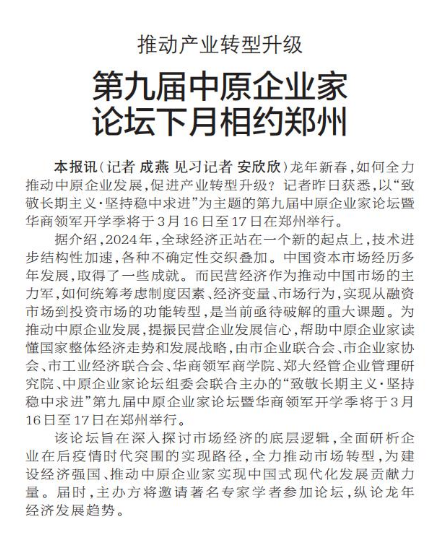 龙年新春,如何全力推动中原企业发展,促进产业转型升级?记者昨日获悉,以“致敬长期主义·坚持稳中求进”为主题的第九届中原企业家论坛暨华商领军开学季将于3月16日至17日在郑州举行。(今日《郑州日报》1版)