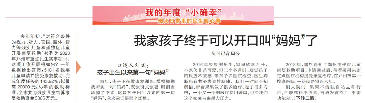 去年年初,“对符合条件的视力、听力、言语、肢体、智力等残疾儿童和孤独症儿童开展康复救助”被列为2023年郑州市重点民生实事项目,这项工作开展得如何?一组数据给出答案:5181名残疾儿童申请并接受康复救助,完成年度任务的143.92%;以最高20000元/人/年的救助标准,全市共为残疾儿童结算康复救助资金5365万元。(今日《郑州日报》1版、2版)