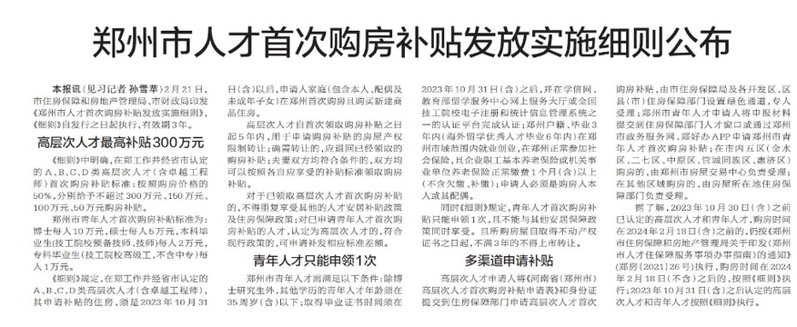 2月21日,市住房保障和房地产管理局、市财政局印发《郑州市人才首次购房补贴发放实施细则》,《细则》自发行之日起执行,有效期3年。(今日《郑州日报》2版)