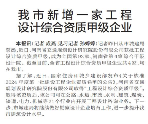 记者昨日从市城建局获悉,近日,河南省交通规划设计研究院股份有限公司获批工程设计综合资质甲级,成为全国第92家、河南省第4家综合甲级设计院。截至目前,全省工程设计综合资质甲级企业共4家,均在我市。(今日《郑州日报》2版)