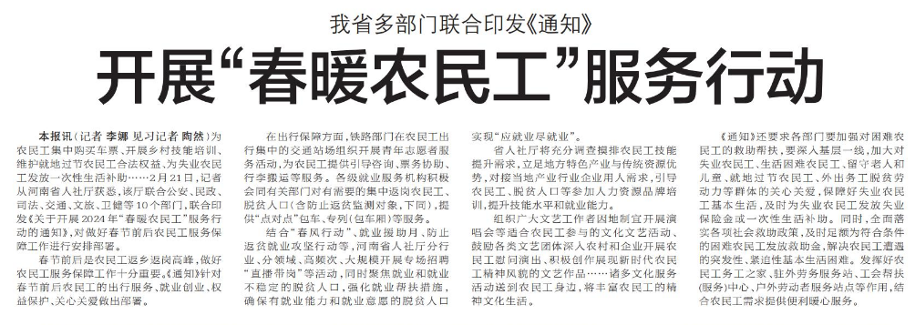 为农民工集中购买车票、开展乡村技能培训、维护就地过节农民工合法权益、为失业农民工发放一次性生活补助……2月21日,记者从河南省人社厅获悉,该厅联合公安、民政、司法、交通、文旅、卫健等10个部门,联合印发《关于开展2024年“春暖农民工”服务行动的通知》,对做好春节前后农民工服务保障工作进行安排部署。(今日《郑州日报》6版)