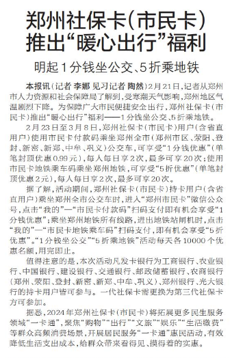 2月21日,记者从郑州市人力资源和社会保障局了解到,受寒潮天气影响,郑州地区气温剧烈下降。为保障广大市民便捷安全出行,郑州社保卡(市民卡)推出“暖心出行”福利——1分钱坐公交、5折乘地铁。(今日《郑州日报》6版)