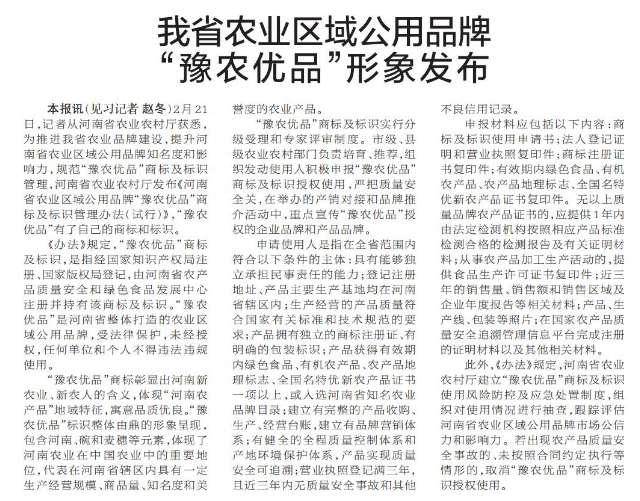 2月21日,记者从河南省农业农村厅获悉,为推进我省农业品牌建设,提升河南省农业区域公用品牌知名度和影响力,规范“豫农优品”商标及标识管理,河南省农业农村厅发布《河南省农业区域公用品牌“豫农优品”商标及标识管理办法(试行)》,“豫农优品”有了自己的商标和标识。(今日《郑州日报》6版)
