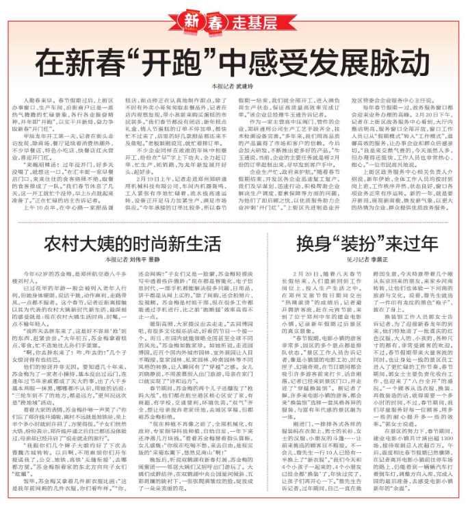 已过花甲的年龄一般会被列入老年人行列,但她身体硬朗,说话干脆,动作麻利,走路带风,一点都不服老。这个春节,记者近距离接触以其为代表的农村大姨新时代新生活,最深刻的感受就是:现在农村大姨生活时尚、时髦,一点不输年轻人。(今日《郑州日报》7版)