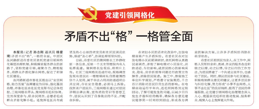 矛盾不出“格”,一格管全面。中原区汝河路街道市委社区依托党建引领网格化基层治理机制,积极探索服务群众的新路子,坚持党建引领,凝聚合力,精细服务,将群众矛盾化解在网格,促进了和谐社区建设。(今日《郑州日报》7版)