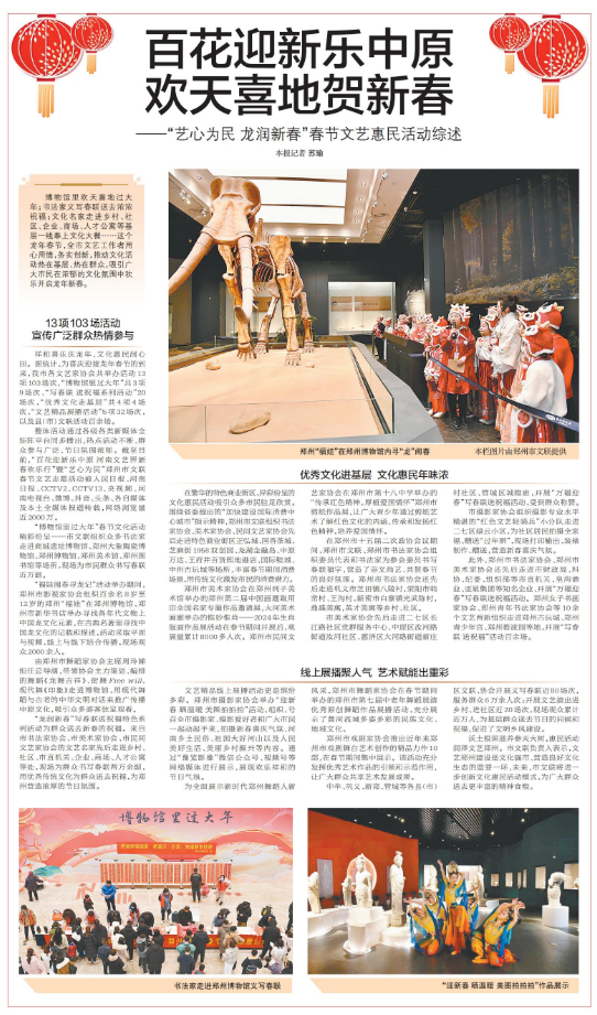 博物馆里欢天喜地过大年;书法家义写春联送去浓浓祝福;文化名家走进乡村、社区、企业、商场、人才公寓等基层一线奉上文化大餐……这个龙年春节,全市文艺工作者用心用情,务实创新,推动文化活动热在基层、热在群众,吸引广大市民在浓郁的文化氛围中欢乐开启龙年新春。(今日《郑州日报》8版)