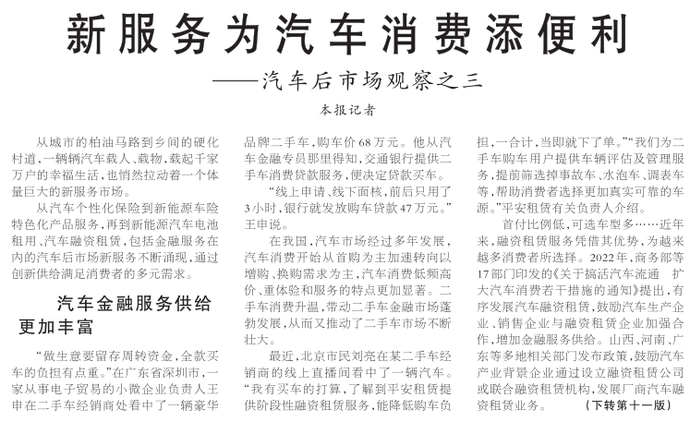 从汽车个性化保险到新能源车险特色化产品服务,再到新能源汽车电池租用、汽车融资租赁,包括金融服务在内的汽车后市场新服务不断涌现,通过创新供给满足消费者的多元需求。(今日《人民日报》1版、11版)