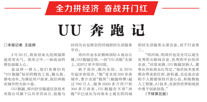 是这样一群人,他们身着印有“UU跑腿”标识的橙色工装,戴头盔、骑电动车,为满足用户需求,依旧奔跑在城市的大街小巷。(今日《河南日报》1版、5版)