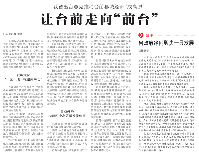 县域经济是我省高质量发展的强力支撑、坚实底盘。今年是习近平总书记提出“县域治理‘三起来’”重要论述十周年,2月21日,记者从省发展改革委获悉,省政府近日出台《关于支持台前县域经济高质量发展的意见》,推动台前在县域经济“成高原”上勇立潮头,加快走向高质量发展“前台”。(今日《河南日报》2版)