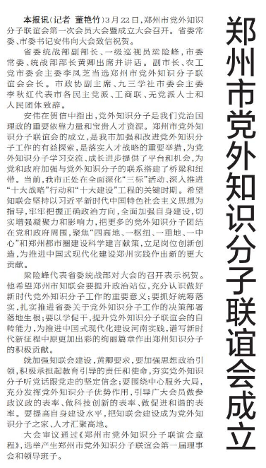 3月22日,郑州市党外知识分子联谊会第一次会员大会暨成立大会召开。省委常委、市委书记安伟向大会致信祝贺。(今日《郑州日报》1版)