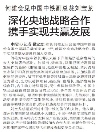 市长何雄近日会见中国中铁股份有限公司副总裁刘宝龙一行,就深化央地战略合作、携手实现共赢发展进行深入交流。(今日《郑州日报》1版)