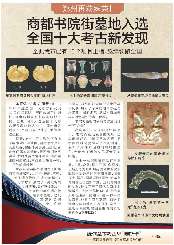 昨日,2023年度全国十大考古新发现22日在京揭晓。河南永城王庄遗址、河南郑州商都书院街墓地上榜。至此,河南入选全国十大考古新发现总数达55个,郑州市先后有16个项目获此殊荣,继续领跑全国。(今日《郑州日报》1版、4版)