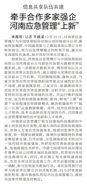 3月22日,河南省应急管理厅与中国铁塔股份有限公司河南省分公司、豫地科技集团、中国建筑第七工程局等单位签订合作框架协议,助力应急管理模式的转型升级,健全应急救援队伍体系,提升突发灾害应对能力。(今日《郑州日报》2版)