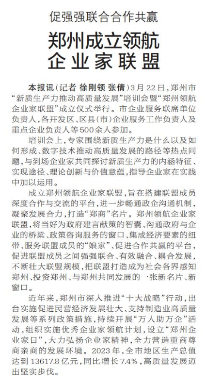 3月22日,郑州市“新质生产力推动高质量发展”培训会暨“郑州领航企业家联盟”成立仪式举行。市企业服务联席单位负责人,各开发区、区县(市)企业服务工作负责人及重点企业负责人等500余人参加。(今日《郑州日报》2版)