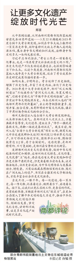 从中原到边疆,从河南郑州商都书院街墓地到甘肃礼县四角坪遗址……3月22日揭晓的2023年度全国十大考古新发现,如同在中华大地上翻开的一页页历史华章,刻印着神州大地上早期人类的起源历程,展示着中华文明的灿烂成就,诠释着中华文明多元一体的发展过程。(今日《郑州日报》4版)