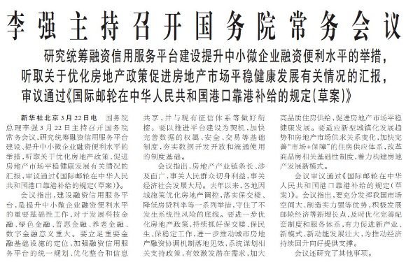 国务院总理李强3月22日主持召开国务院常务会议,研究统筹融资信用服务平台建设、提升中小微企业融资便利水平的举措,听取关于优化房地产政策、促进房地产市场平稳健康发展有关情况的汇报,审议通过《国际邮轮在中华人民共和国港口靠港补给的规定(草案)》。(今日《人民日报》1版)