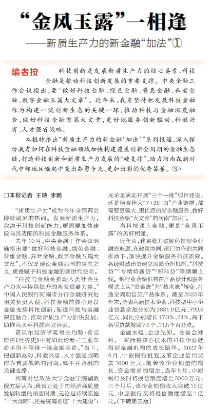 本报特推出“新质生产力的新金融‘加法’”系列报道,深入探访我省如何在科技金融领域加快构建覆盖创新全周期的金融生态链,打造科技创新和新质生产力发展的“硬支撑”,助力河南在新时代中部地区崛起中交出奋勇争先、更加出彩的优秀答卷。