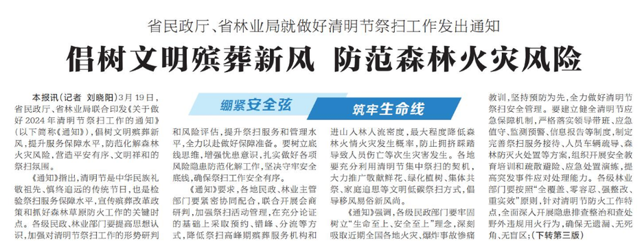 3月19日,省民政厅、省林业局联合印发《关于做好2024年清明节祭扫工作的通知》,倡树文明殡葬新风,提升服务保障水平,防范化解森林火灾风险,营造平安有序、文明祥和的祭扫氛围。(今日《河南日报》1版、3版)