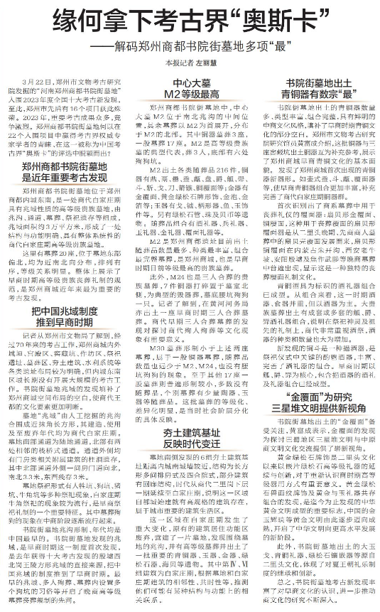 3月22日,郑州市文物考古研究院发掘的“河南郑州商都书院街墓地”入围2023年度全国十大考古新发现,至此,郑州市先后有16个项目获此殊荣。2023年,重要考古成果众多,竞争激烈。郑州商都书院街墓地何以在22个入围项目中赢得考古界权威专家学者的青睐、在这一被称为中国考古界“奥斯卡”的评选中脱颖而出?(今日《郑州日报》4版)