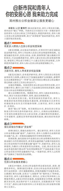 解决好新市民、青年人等住房问题,郑州出台“暖心”举措。市政府近日印发《关于进一步做好新市民和青年人住房公积金工作的意见》,将更多新市民、青年人纳入住房公积金制度保障,助力“来郑留郑”就业的新市民、青年人更好地实现安居。(今日《郑州日报》2版)