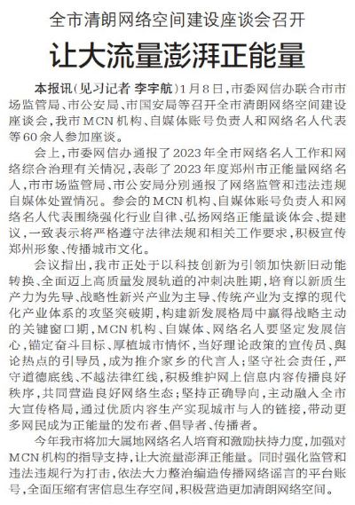1月8日,市委网信办联合市市场监管局、市公安局、市国安局等召开全市清朗网络空间建设座谈会,我市MCN机构、自媒体账号负责人和网络名人代表等60余人参加座谈。(今日《郑州日报》2版)