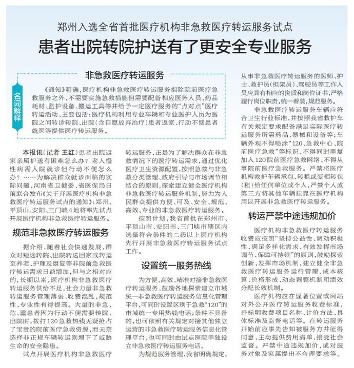 郑州入选全省首批医疗机构非急救医疗转运服务试点