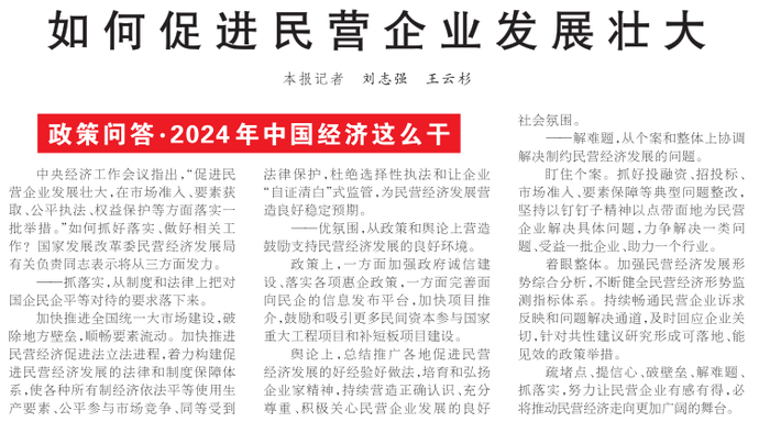 中央经济工作会议指出,“促进民营企业发展壮大,在市场准入、要素获取、公平执法、权益保护等方面落实一批举措。”如何抓好落实、做好相关工作?国家发展改革委民营经济发展局有关负责同志表示将从三方面发力。(今日《人民日报》1版)