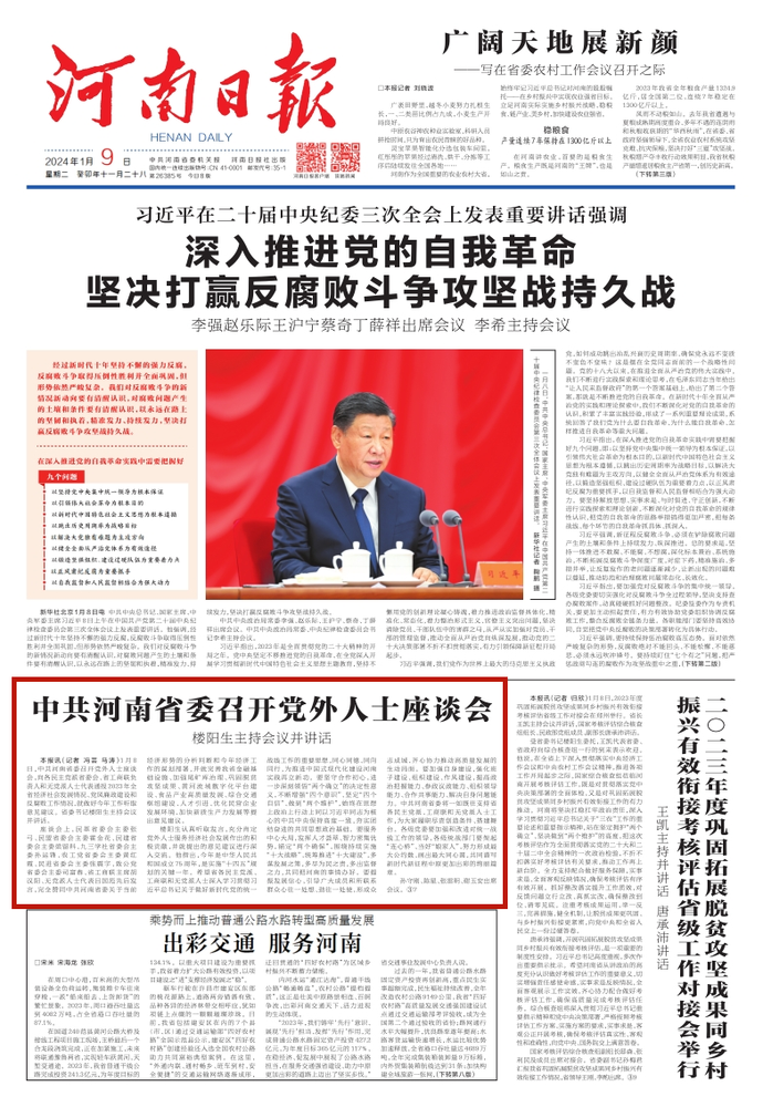 1月8日,中共河南省委召开党外人士座谈会,向各民主党派省委会、省工商联负责人和无党派人士代表通报2023年全省经济社会发展情况、党风廉政建设和反腐败工作情况,就做好今年工作听取意见建议。省委书记楼阳生主持会议并讲话。(今日《河南日报》1版)