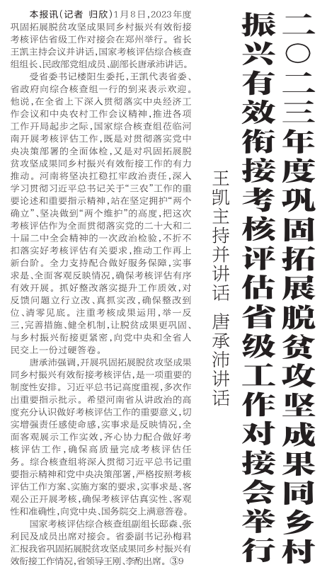1月8日,2023年度巩固拓展脱贫攻坚成果同乡村振兴有效衔接考核评估省级工作对接会在郑州举行。省长王凯主持会议并讲话,国家考核评估综合核查组组长、民政部党组成员、副部长唐承沛讲话。(今日《河南日报》1版)
