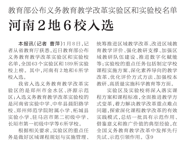 1月8日,记者从省教育厅获悉,近日教育部公布义务教育教学改革实验区和实验校名单,全国63个实验区和189所实验校上榜。其中,河南有2地和6所学校入选。(今日《河南日报》2版)