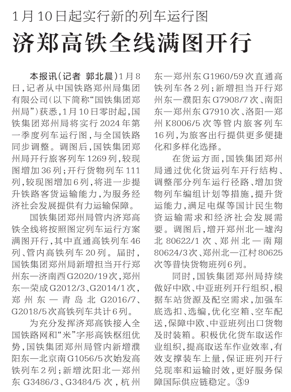 记者昨日从国铁集团郑州局获悉,1月10日零时起,国铁集团郑州局将实行2024年第一季度列车运行图,与全国铁路同步调整。调图后,国铁集团郑州局开行旅客列车1269列,较现图增加36列;开行货物列车111列,较现图增加6列,将进一步提升铁路客货运输能力,为服务经济社会发展提供有力运输保障。(今日《郑州日报》1版、2版)