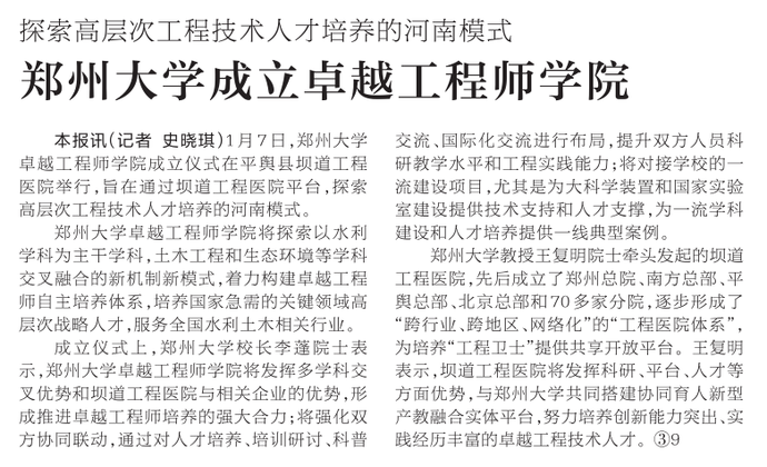 1月7日,郑州大学卓越工程师学院成立仪式在平舆县坝道工程医院举行,旨在通过坝道工程医院平台,探索高层次工程技术人才培养的河南模式。(今日《河南日报》4版)