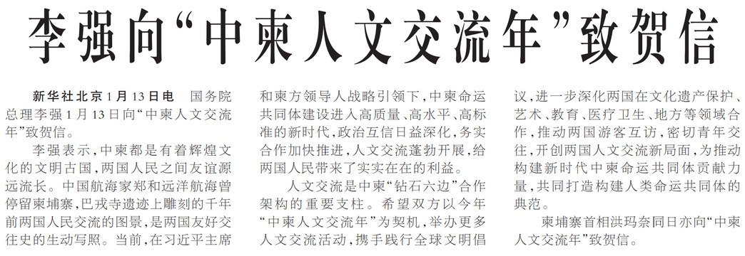国务院总理李强1月13日向“中柬人文交流年”致贺信。