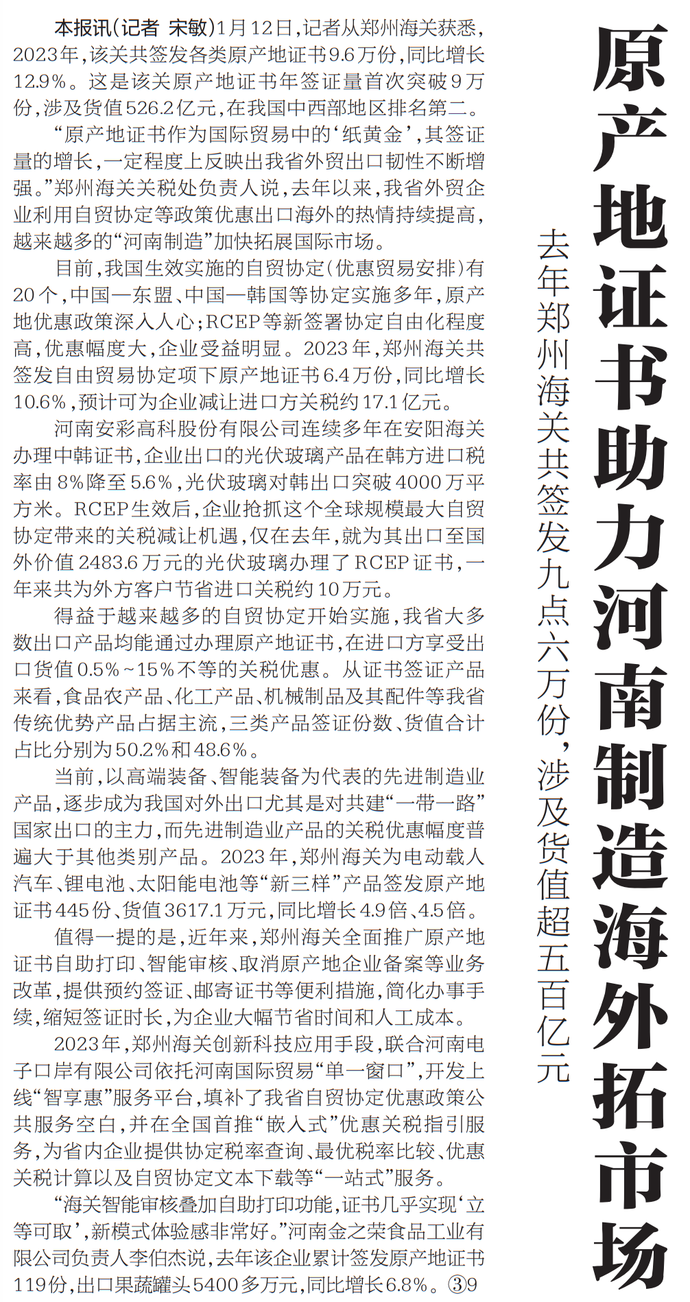 去年郑州海关共签发九点六万份,涉及货值超五百亿元