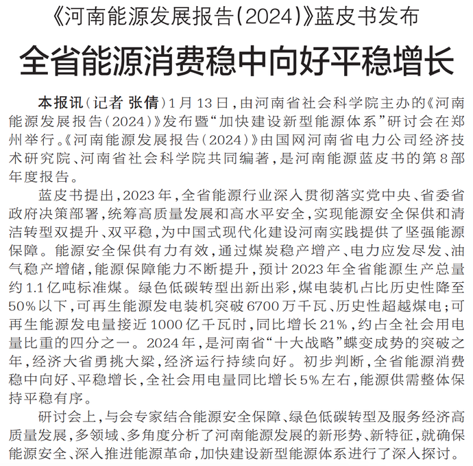 1月13日,由河南省社会科学院主办的《河南能源发展报告(2024)》发布暨“加快建设新型能源体系”研讨会在郑州举行。《河南能源发展报告(2024)》由国网河南省电力公司经济技术研究院、河南省社会科学院共同编著,是河南能源蓝皮书的第8部年度报告。(今日《郑州日报》1版)
