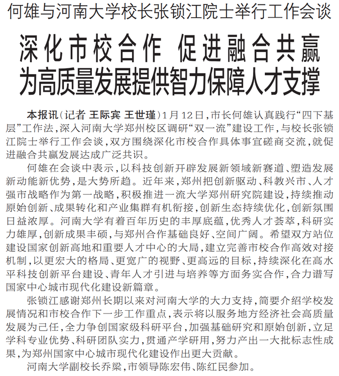1月12日,市长何雄认真践行“四下基层”工作法,深入河南大学郑州校区调研“双一流”建设工作,与校长张锁江院士举行工作会谈,双方围绕深化市校合作具体事宜磋商交流,就促进融合共赢发展达成广泛共识。(今日《郑州日报》1版)