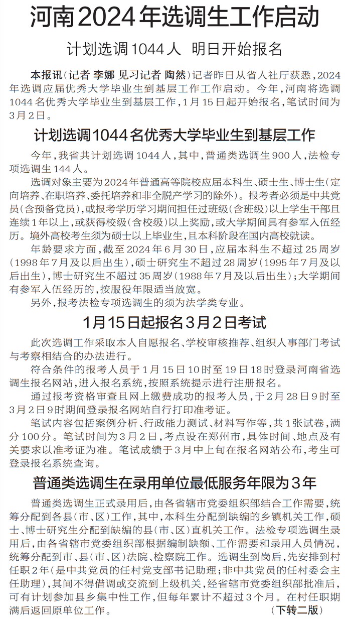 记者昨日从省人社厅获悉,2024年选调应届优秀大学毕业生到基层工作工作启动。今年,河南将选调1044名优秀大学毕业生到基层工作,1月15日起开始报名,笔试时间为3月2日。(今日《郑州日报》1版、2版)