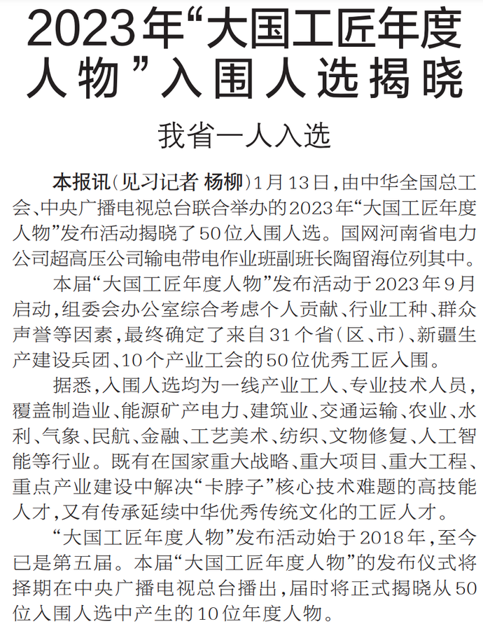 1月13日,由中华全国总工会、中央广播电视总台联合举办的2023年“大国工匠年度人物”发布活动揭晓了50位入围人选。国网河南省电力公司超高压公司输电带电作业班副班长陶留海位列其中。(今日《郑州日报》1版)