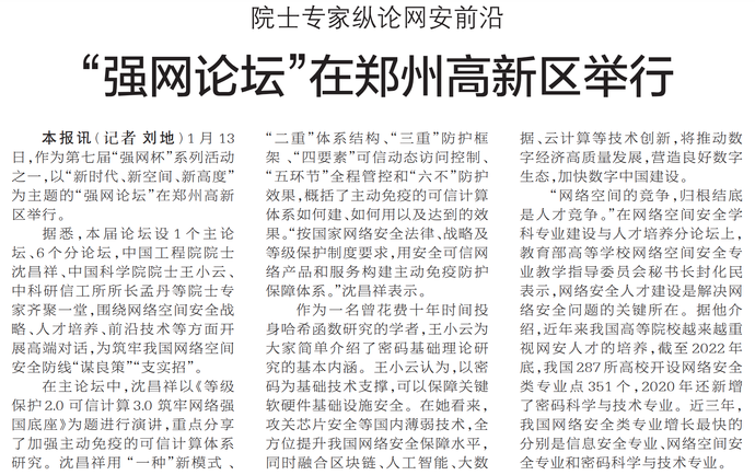 1月13日,作为第七届“强网杯”系列活动之一,以“新时代、新空间、新高度”为主题的“强网论坛”在郑州高新区举行。(今日《郑州日报》1版)