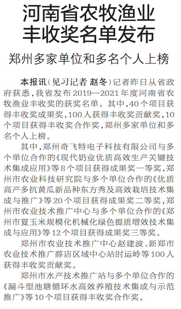 记者昨日从省政府获悉,我省发布2019—2021年度河南省农牧渔业丰收奖的获奖名单。其中,40个项目获得丰收奖成果奖,100人获得丰收奖贡献奖,10个项目获得丰收奖合作奖,郑州多家单位和多名个人上榜。(今日《郑州日报》2版)