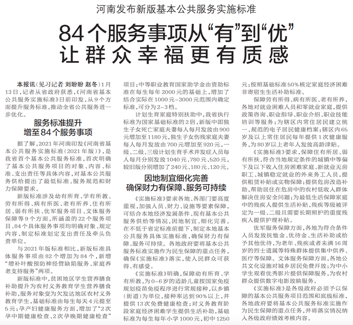 1月13日,记者从省政府获悉,《河南省基本公共服务实施标准》日前印发,从9个方面提升服务标准,推动全省公共服务进一步优化。(今日《郑州日报》2版)
