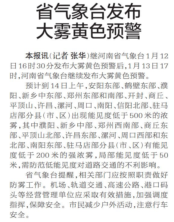 继河南省气象台1月12日16时30分发布大雾黄色预警后,1月13日17时,河南省气象台继续发布大雾黄色预警。(今日《郑州日报》2版)