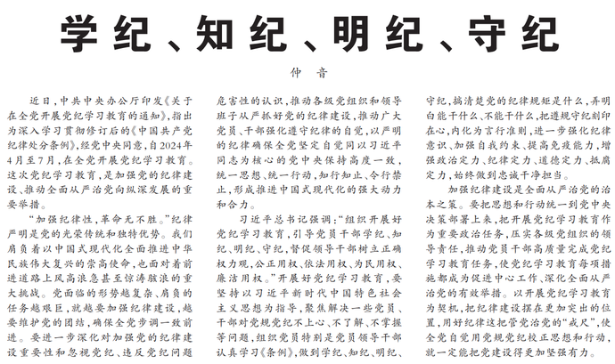 近日,中共中央办公厅印发《关于在全党开展党纪学习教育的通知》,指出为深入学习贯彻修订后的《中国共产党纪律处分条例》,经党中央同意,自2024年4月至7月,在全党开展党纪学习教育。这次党纪学习教育,是加强党的纪律建设、推动全面从严治党向纵深发展的重要举措。(今日《人民日报》1版)