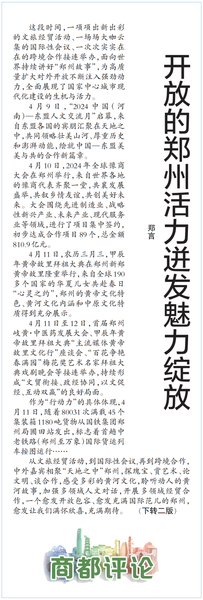 这段时间,一项项出新出彩的文旅经贸活动、一场场大咖云集的国际性会议、一次次实实在在的跨境合作接连举办,面向世界持续讲好“郑州故事”,为高质量扩大对外开放不断注入强劲动力,全面展现了国家中心城市现代化建设的生机与活力。(今日《郑州日报》1版、2版)