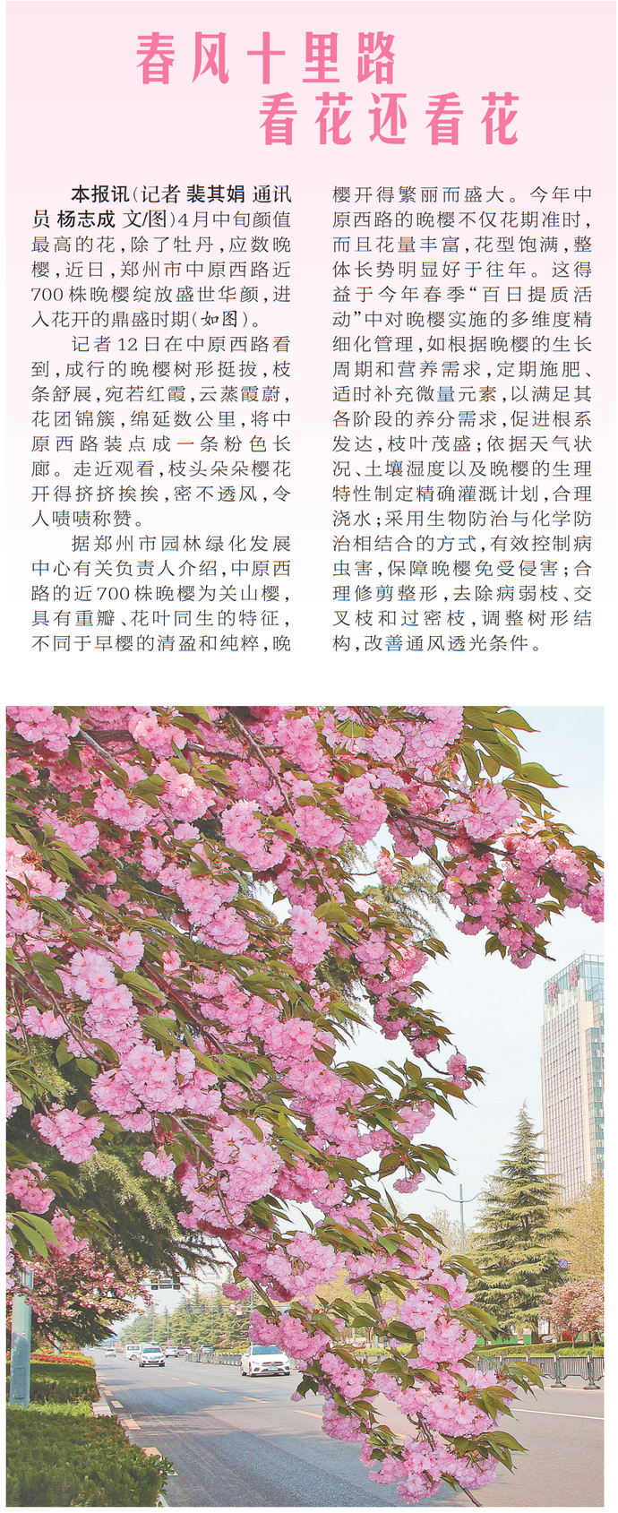 4月中旬颜值最高的花,除了牡丹,应数晚樱,近日,郑州市中原西路近700株晚樱绽放盛世华颜,进入花开的鼎盛时期。(今日《郑州日报》1版)